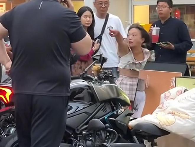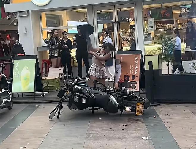 等到女孩从地上起来后,冲到女车主身边拉扯,车主朋友把两人分开,随后就是她砸摩托车的情节,以及试图用打火机点燃摩托车。
