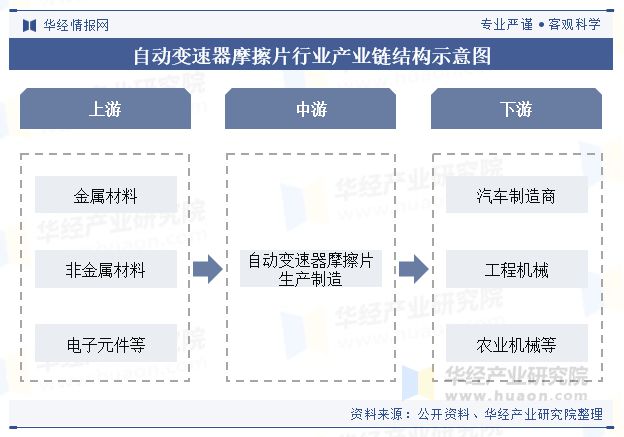 自动变速器摩擦片行业产业链上游产业主要由原材料供应商构成,这些原材料的质量和成本直接影响变速器的性能和制造成本。具体包括金属材料、非金属材料、电子元件等。中游产业是变速器的研发与制造环节。下游产业则包括汽车制造商和售后服务市场以及工程机械和农机领域。