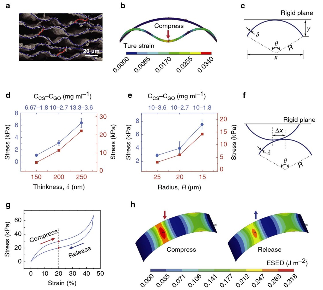 (a) C-G弹性体薄层之间的链接细节;(b) 理论模拟显示该材料的结构单位模型薄壳结构在发生大变形时其内部具有很小应变;(c) 分析该结构单元弹性性能的结构模型;( d) 具有不同层厚的C-G弹性体(蓝色)及薄壳模型(红色)的压缩应力;(e) 有不同收缩程度的C-G弹性体(蓝色)及不同半径的薄壳模型(红色)的压缩应力;(f ) 分析相邻拱单元之间摩擦情况的结构模型;(g) 理论模拟得到的交错的拱单元之间相互挤压时的应力应变曲线;(h) 理论模拟得到的对应(g)中20%应变时模型的能量分布情况