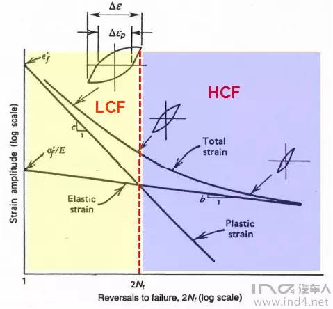 这是因为转变寿命把应变-寿命曲线分为两个区域,也就是前文提到的低周疲劳寿命(LCF=Low Cycle Fatigue)和高周疲劳寿命(HCF= High Cycle Fatigue),分别见上图的左边LCF区域和右边HCF区域。