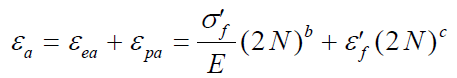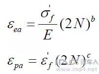 从前文可知,在稳定的滞后环上,总应变幅εa由弹性应变幅εea和塑性应变幅εpa这两个成分组成的。咳咳,敲黑板!下面划重点啦。弹性应变幅εea和塑性应变幅εpa两兄弟和寿命在log-log坐标系里面都很幸运的成线性关系,也即是上图中的Plastic strain和Elastic strain的两条直线。 啥也不说了,上公式吧。